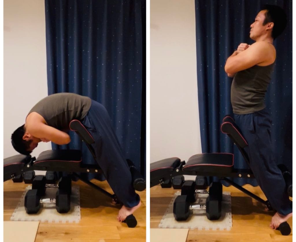背中を丸めずに伸ばしたまま、脚の付け根を支点にするようにして上体の上下を繰り返すと、脊柱起立筋の効果は弱まり、大殿筋やハムストリングに効きやすくなります。