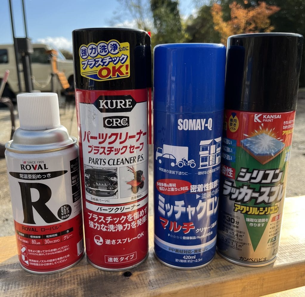 ローバルは塗布面と化学反応を起こして防錆効果を発揮するので、他の塗装材を使う前に塗布面を綺麗にして脱脂スプレーをした後に使います。