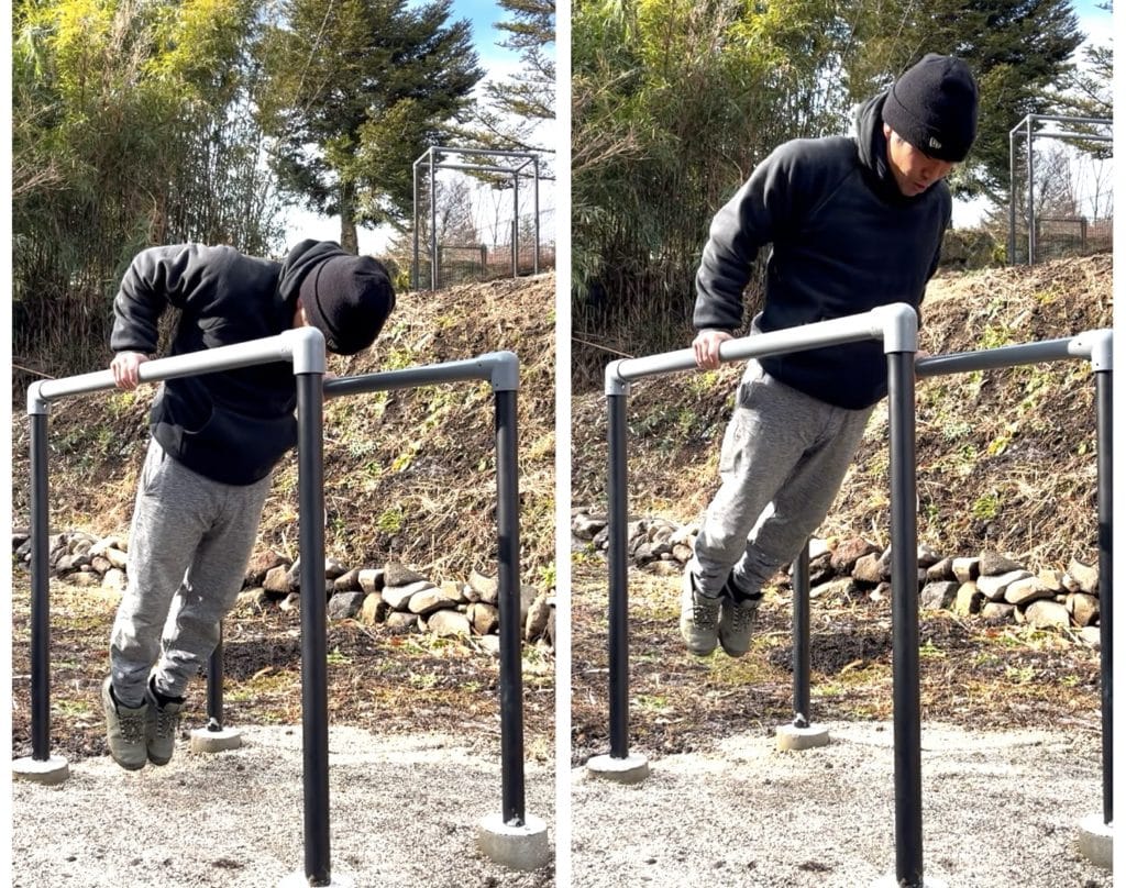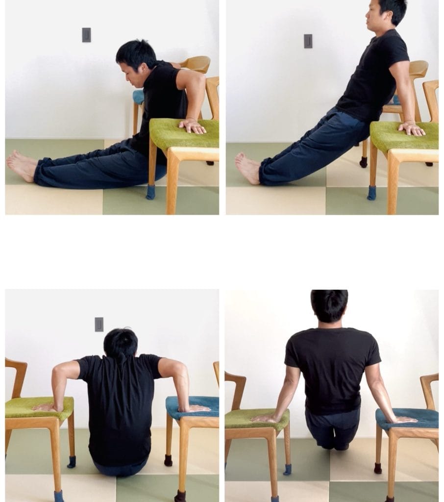 ディップスとは、左右並行な2つのバーや、台などに手を置いて、身体を押し上げたり沈めたりする反復動作です。