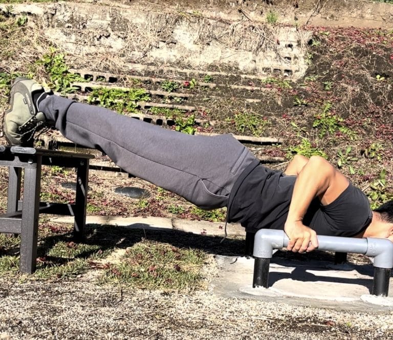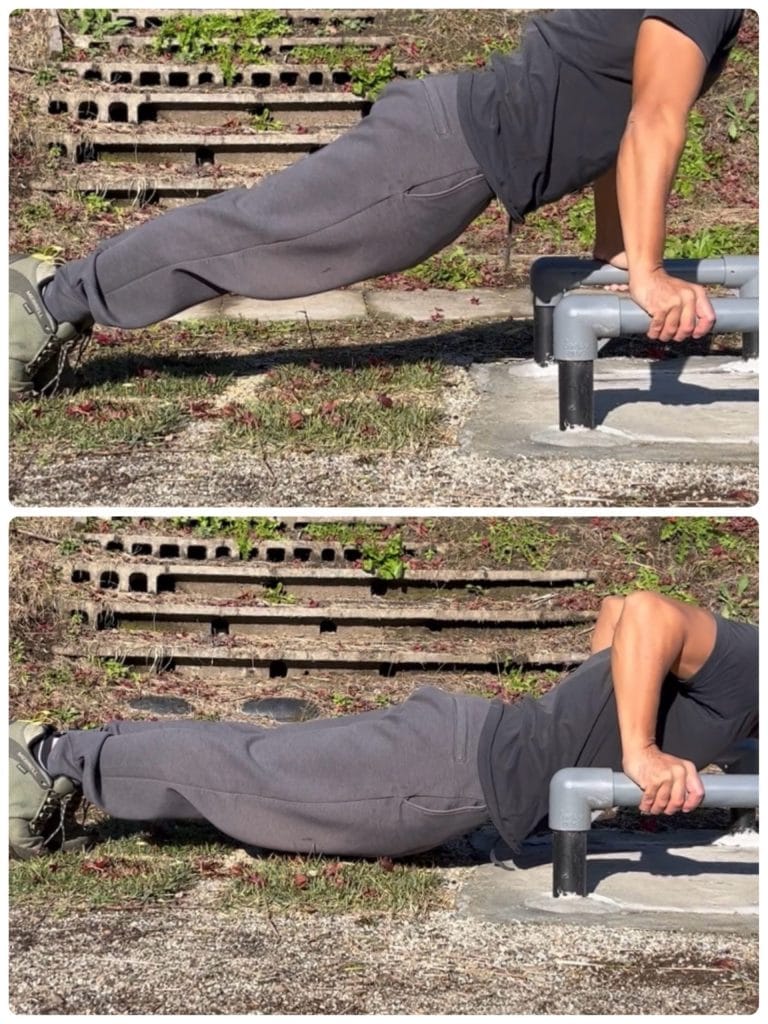 プッシュアップバーを使用する場合は、プッシュアップバーの高さ分、身体の傾きの角度が小さくなるので、そこも含めて高さ調整をしてみてください。(なかなか丁度良い高さの台が見当たらなかったりします、、)