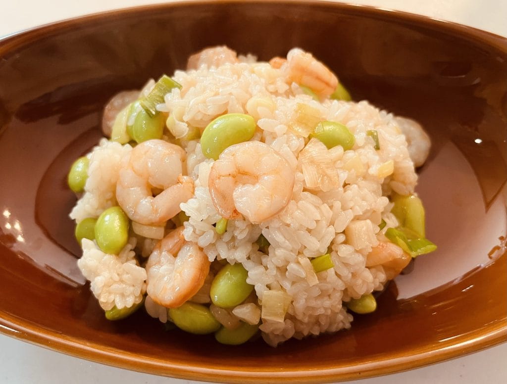 まずは、冷凍枝豆と冷凍むきエビを使うチャーハンです。たんぱく質も糖質もたっぷり摂れます。