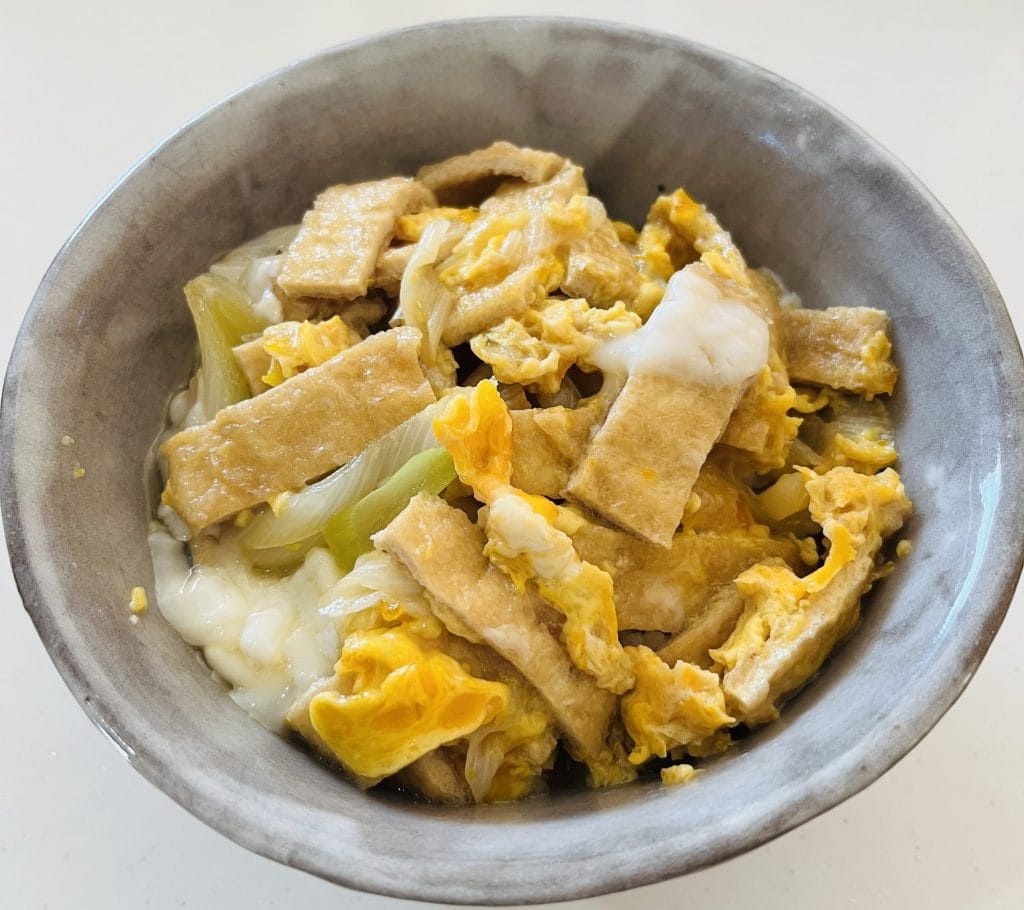 次は衣笠丼です。生揚げや油揚げをネギと一緒に卵でとじます。