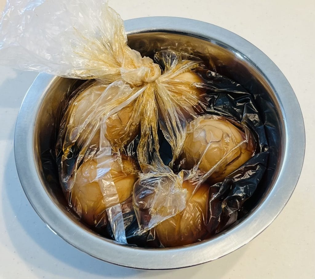ゆで卵と調味料を合わせます。先ほども書きましたが、ビニール袋やジップロックなどを使用すると卵をしっかりと調味料に漬け込みやすいです。