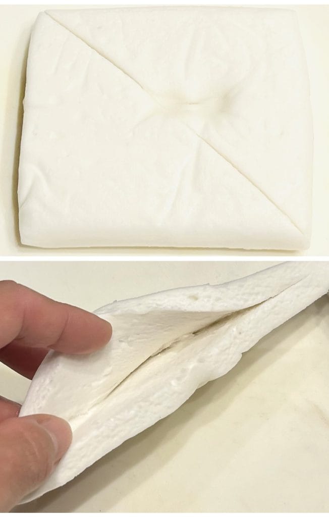 写真のようになった2つの三角形のうちの1つを、はんぺんの切り込みの形に合わせるようにして入れ込みます。