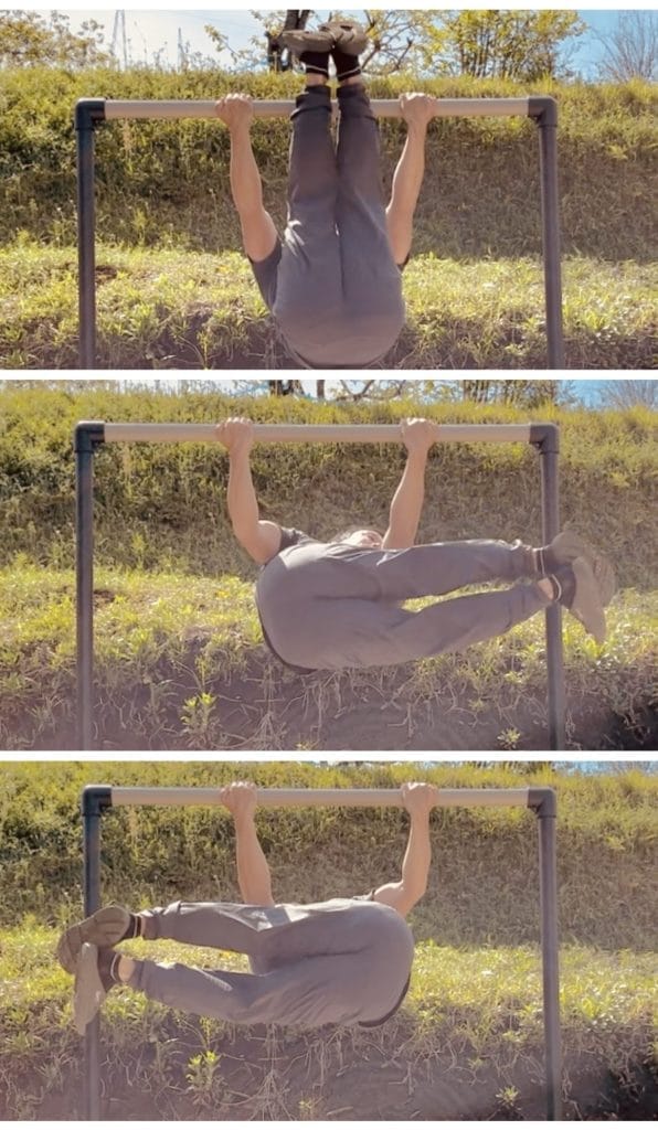鉄棒などのバーにぶら下がり、上体が水平になるくらいまで両足を振り上げて体幹を捻る動作です。