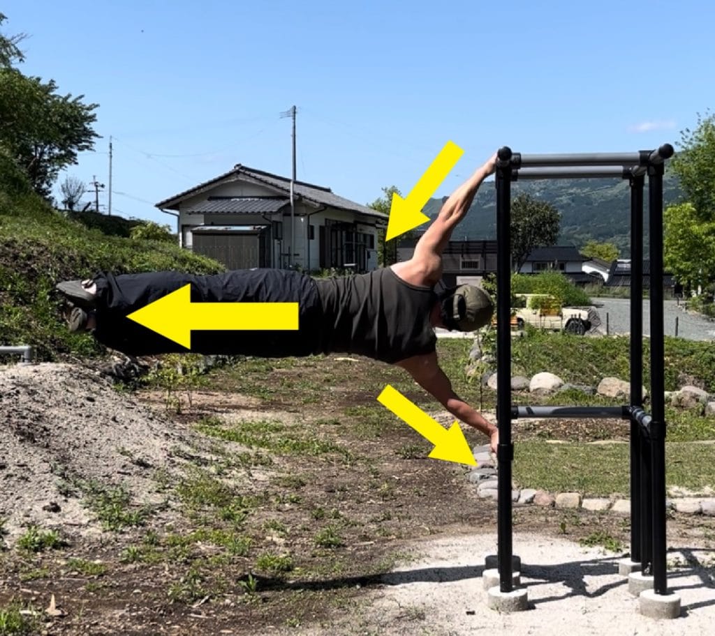 逆に言えば、水平の姿勢が保てないうちは、脚を上げて行ったり、あるいは、脚を広げて行うことでヒューマンフラッグの練習をすることができます。