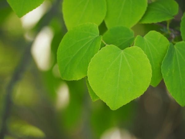 カツラは高木で直線的な樹形に対して、小さな丸みのある葉が特徴的な木です。小さな丸い葉は良く見るとハート形にも見えます。