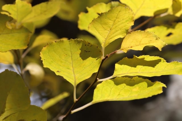 ドウダンツツジととても性質が似ている樹種ですが、花の色が違うのと、紅葉ではなく黄葉する点も違います。サラサドウダンの黄葉は、上で取り上げたクロモジやアオハダに比べると、場合にもよりますが、はっきりとした黄色ではなく、赤みも混ざります。
