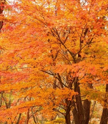 紅色と黄色の間のオレンジ色、茜色、橙色のような色合いが特徴的な木もあります。