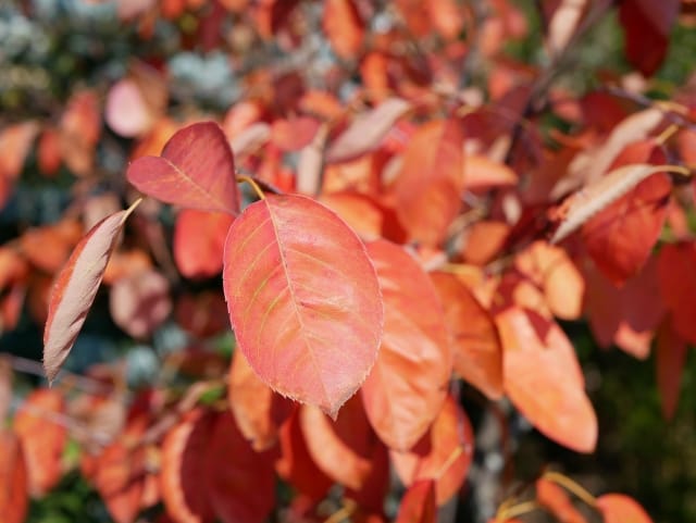 実際はイロハモミジなどの多くの紅葉する木がオレンジ色を経て赤くなったり、オレンジ色のまま落葉したりします。また、黄葉する木のところで紹介したサラサドウダンなどは、個体や環境によってはオレンジ色と言った方が合う色合いになることもあると思います。