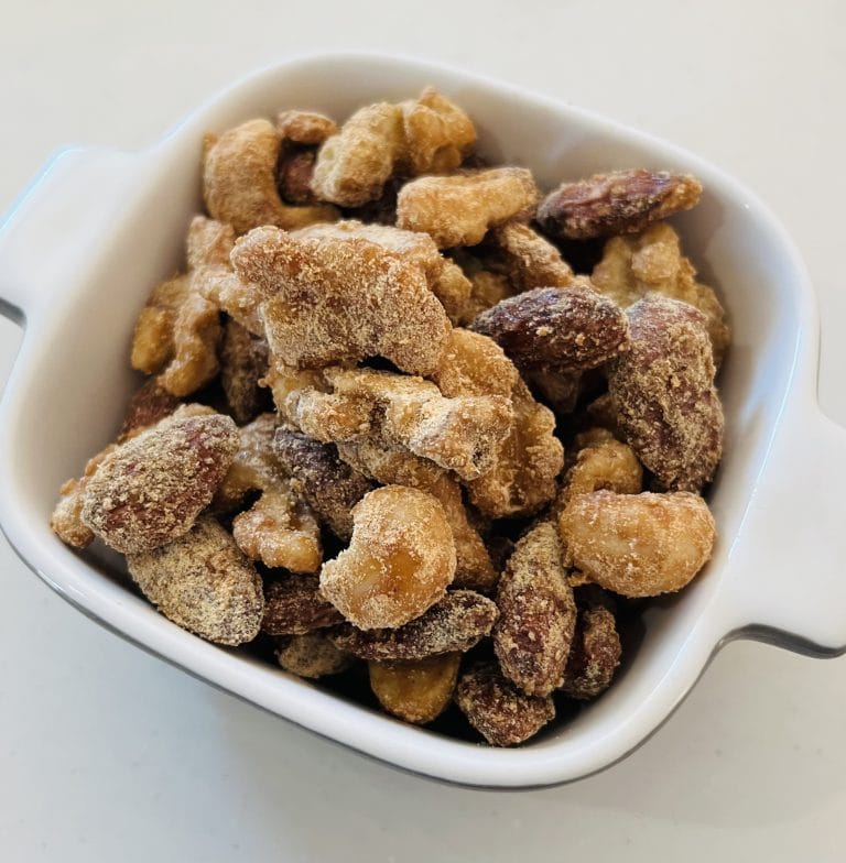 ちなみに、メープルシロップの代わりにはちみつを使ったこともありますが、はちみつだと、冷めた後のナッツどうしのくっつき具合が強く食べづらくなりますのでお気を付けください。