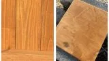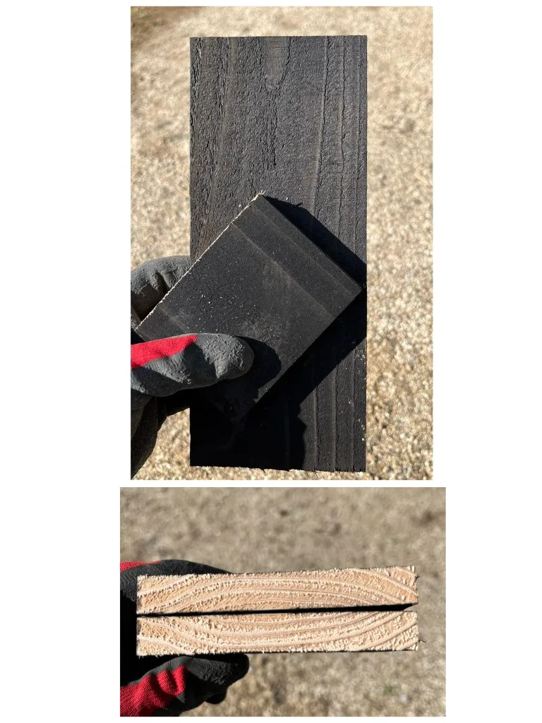 試しに、油性塗料を塗った杉板と水性塗料を塗った杉板を切断して見比べてみました。下がその写真です。