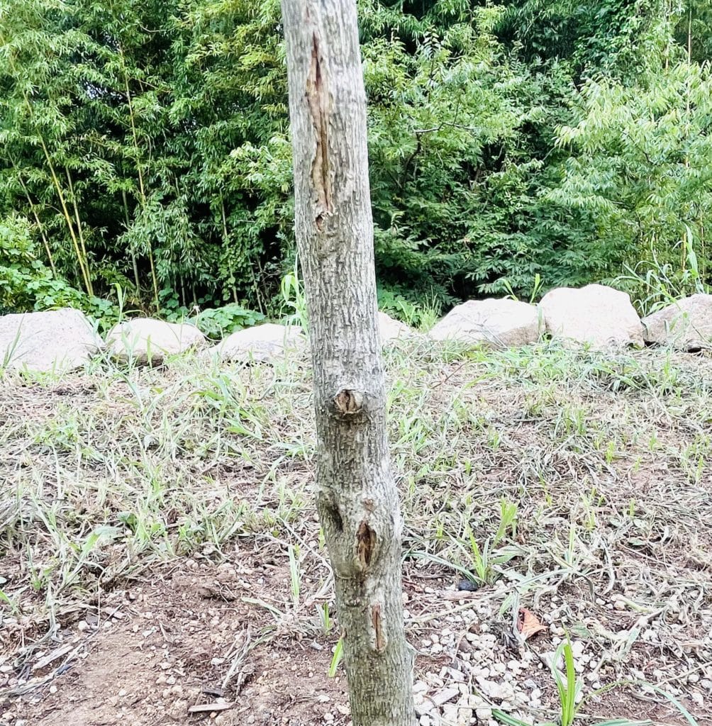 植え付けたのが冬だったのですが、テッポウムシによるダメージが残っているのか、春になると間もなく虫がつき、初夏には、幹の別の部分にヒビのようなものができました。