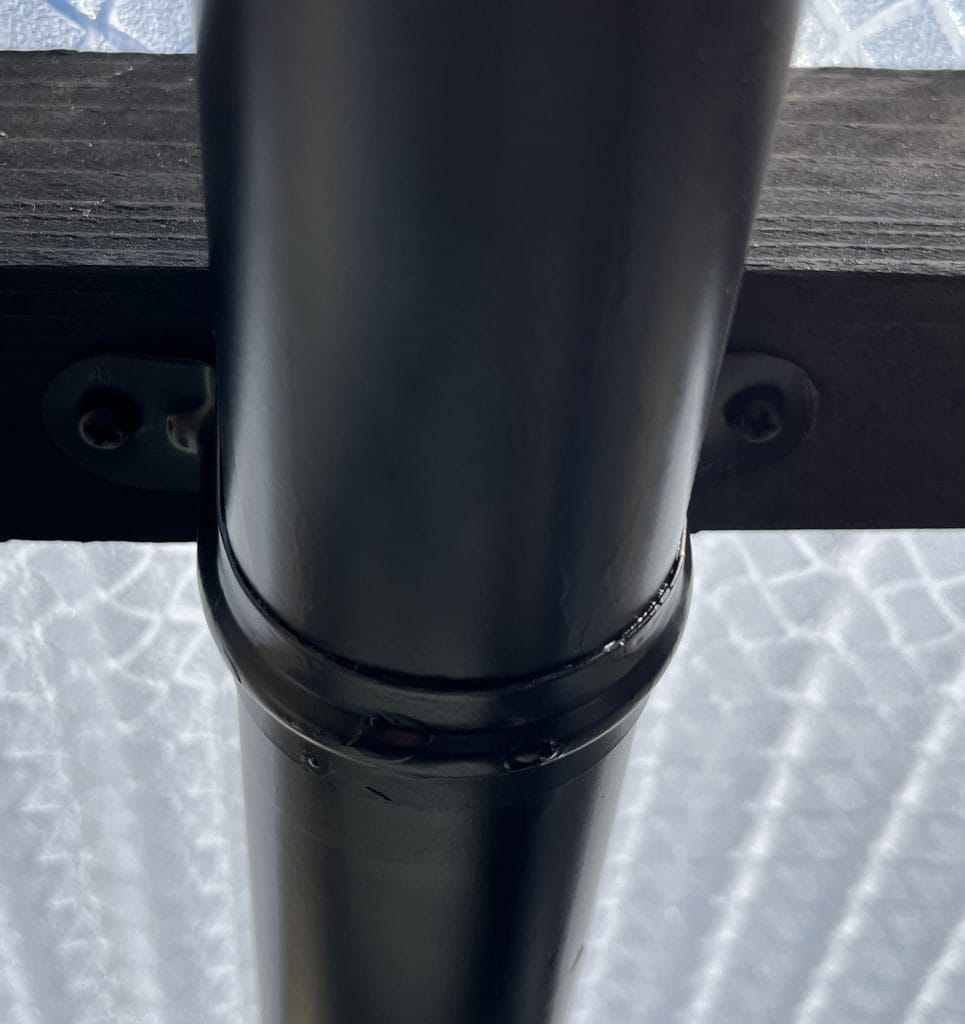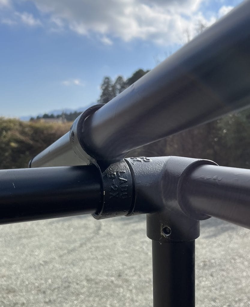 下の写真が実際の骨組みです。ちなみに写真のパイプが黒いのは塗装後だからです。使用しているのは、ホームセンターなどで購入できる一般的な単管パイプです。