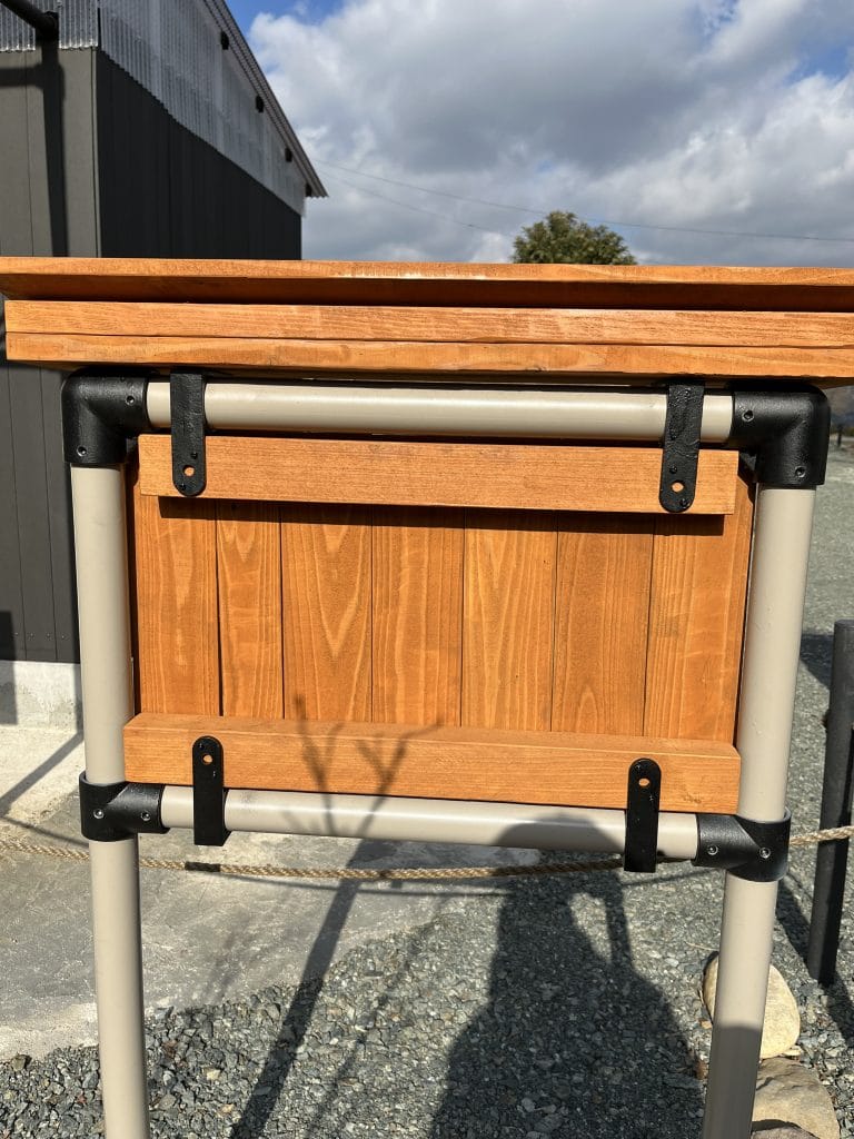 次の写真は単管パイプと杉板で作った看板の裏面です。