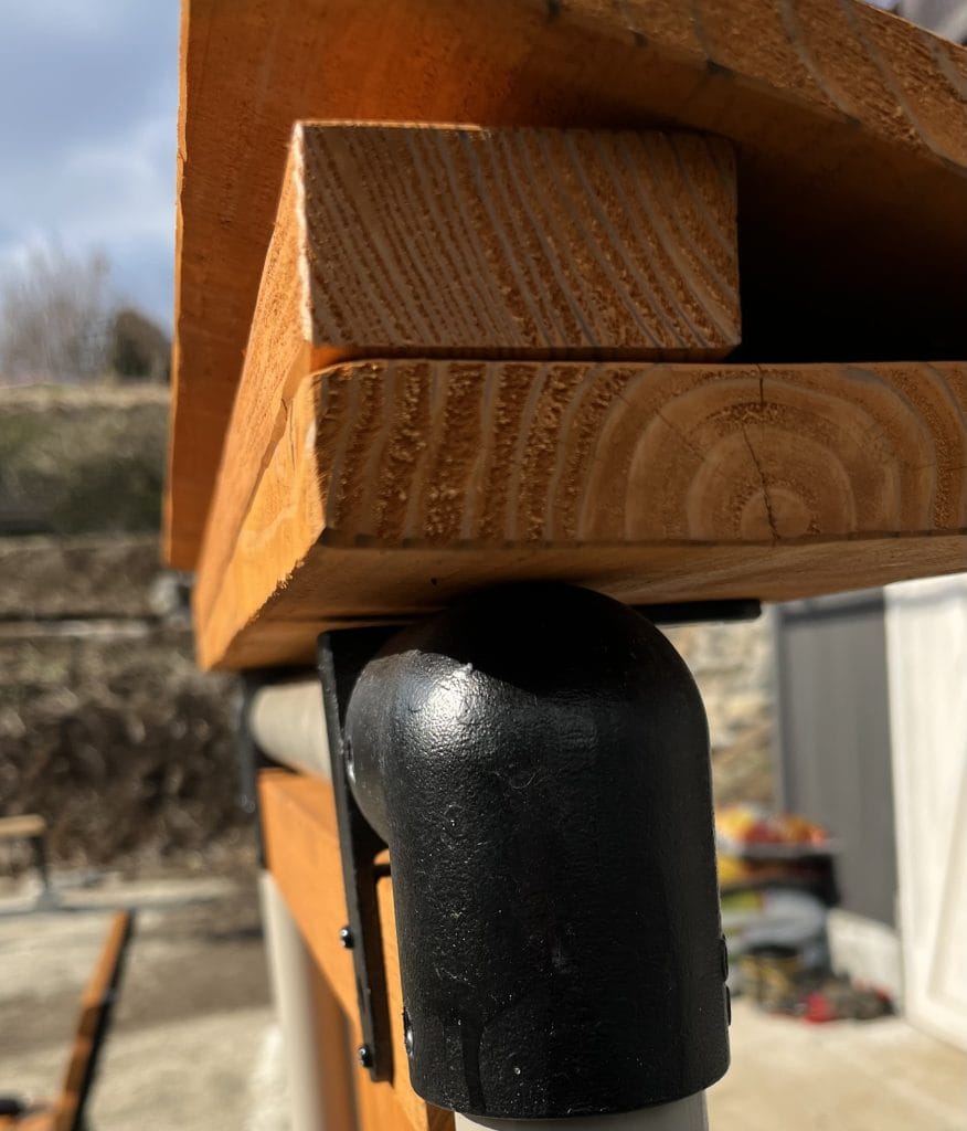 垂木を留めている金具の下の2つは先に取り上げたベンチに使用している、片側に材を取り付けるためのジョイントですが、上の2つは直角に曲がった両辺に材を取り付けることができるジョイントを使用しており、上に雨除けになる庇のようなものを作りました。