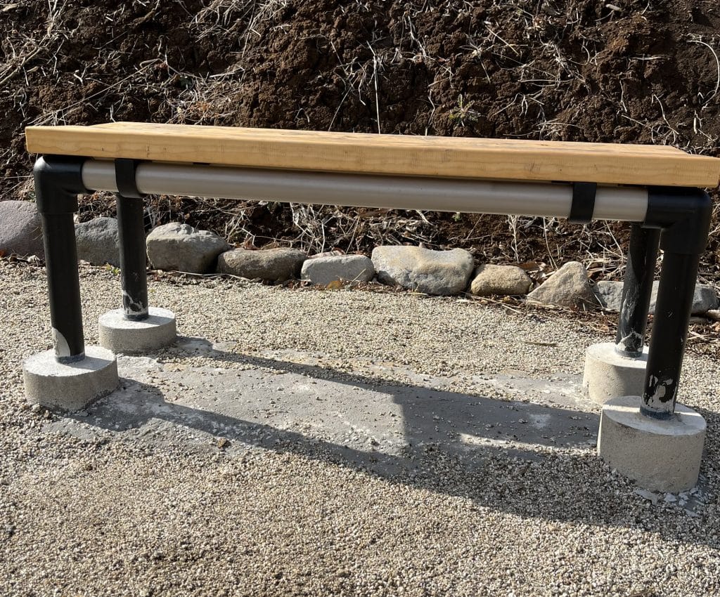 本当はこの木材を土台にして上に改めて座面の木材を取り付けた方が、座面の水平が保たれます。この写真のベンチは、座面の木材どうしが中央に向かって傾いてしまっていますが、構造材として使用している横柱のパイプが支えている形になっています。