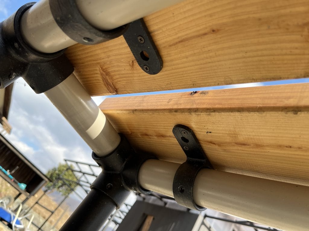 ちなみに、ある程度DIYに慣れている方なら分かると思うのですが、単管パイプに直接ドリルビスなどで垂木を取り付けるのは至難の業ですので、基本的にはおすすめしません。単管パイプに限らず、円筒型のものに対して狙い通りにビスを打つのは、かなり難しいです。