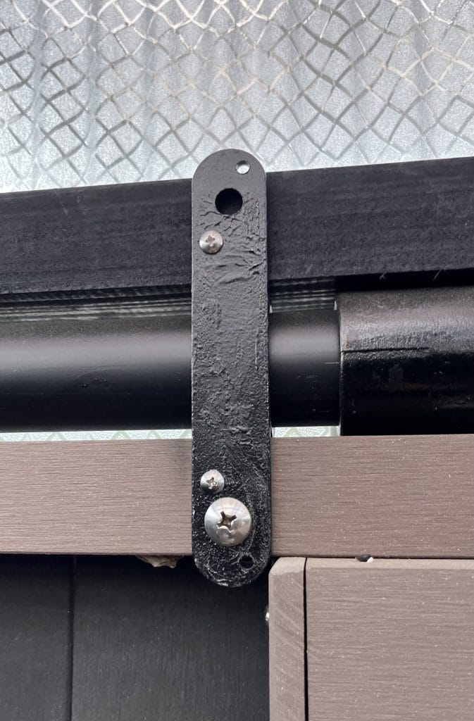 下の写真は、パイプを中心にして両側に材を取り付けることができる金具を使用した例です。これは上で紹介した小屋とは別の小屋で、構造材には人工木をメインに使用しています。金具の片方で構造材と接合し、もう片方に壁材用の垂木を取り付けています。