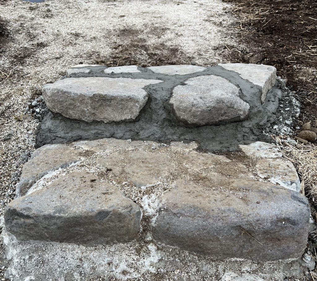 私は石を組む流れで一緒に目地にもモルタルを入れます。一連の流れで固める方が、一体的で強固な段になると思います。
