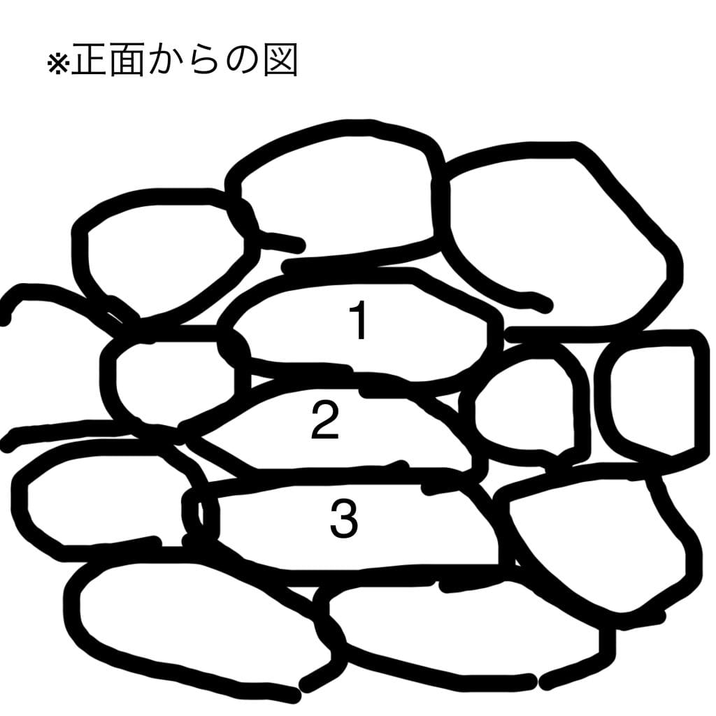 上から見たときに下の絵のような置き方にするイメージで作ると丈夫な石積みになります。