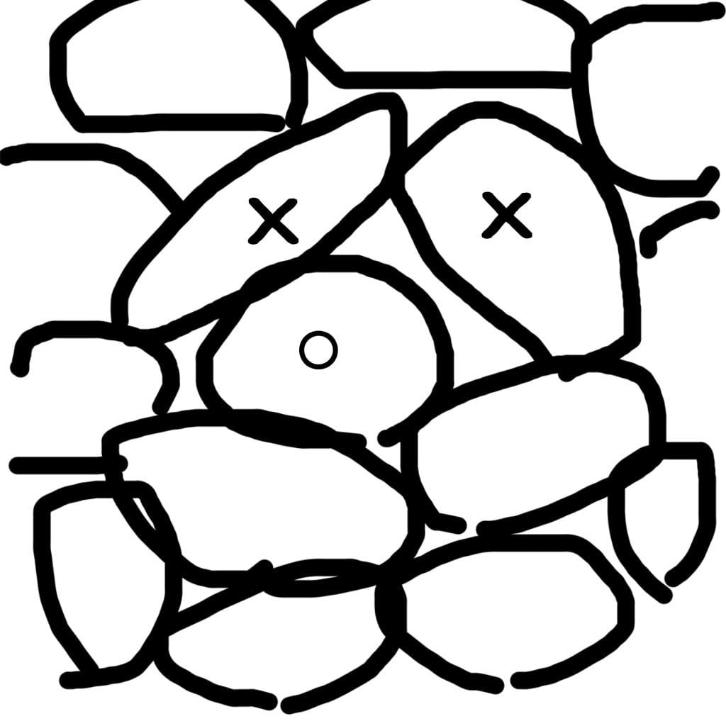 これは伝えづらいのですが、石どうしが寄りかかって、石と石とが人という字を作っているような重さのかけ方をしている状態です。下の図では×と×どうしが寄りかかっていて、下の〇の石に圧がかかっておらず、ズレやすくなります。