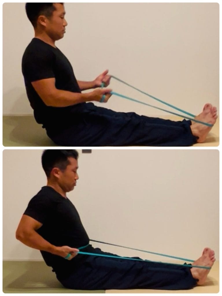 脚を伸ばした姿勢で床に座り、足の裏にチューブをかけて両腕で身体の後方に引きます。