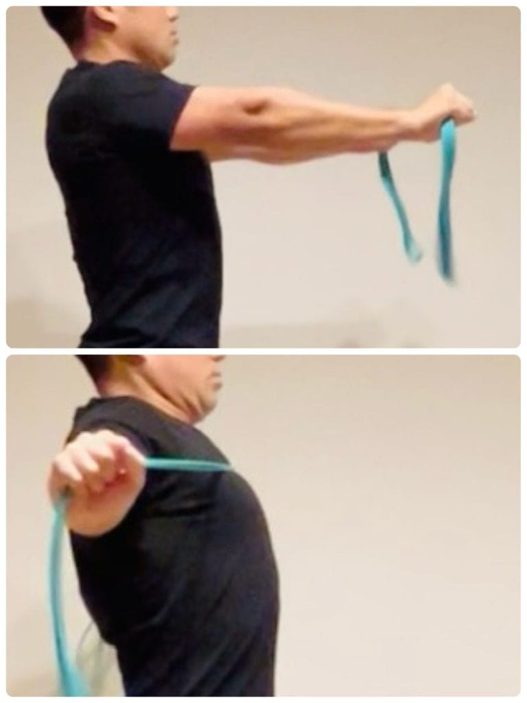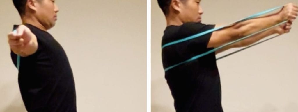 両腕を身体の前方に水平に上げて、チューブが張るように短く持ちます。そこから両腕を開くように水平にチューブを引っ張ります。