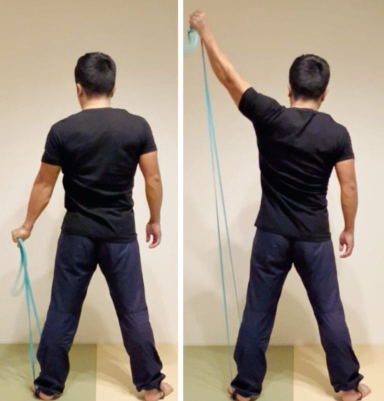 これは肩関節の外転という動作にチューブの負荷をかけたトレーニングで、三角筋の中部や僧帽筋が働きます。