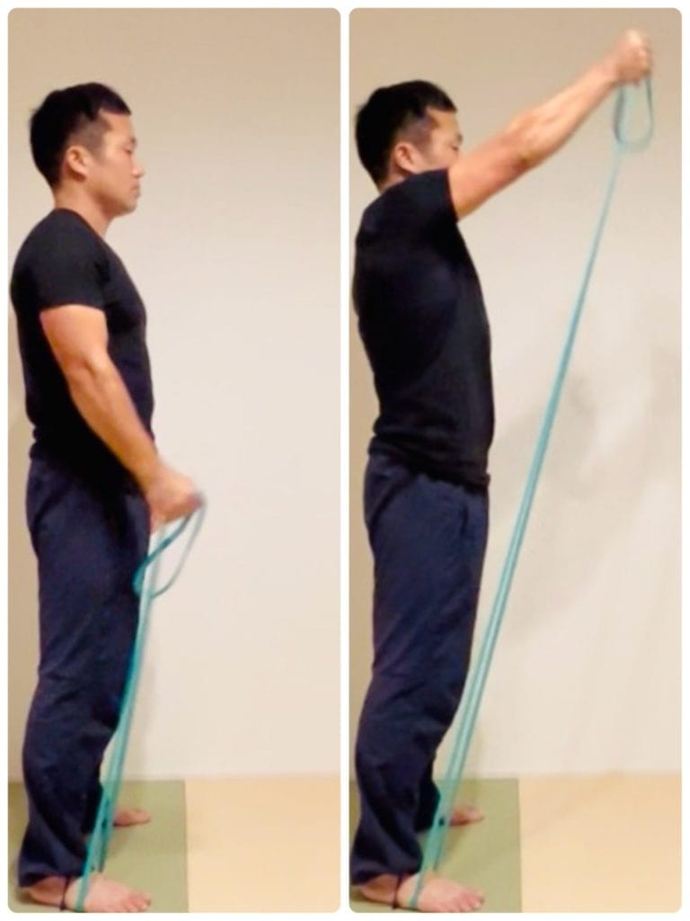 チューブの片端を足で踏んで抑えて、その足と同じ側の腕を脇に下ろしているときにチューブが張るくらいの長さで手に持ち、肘を伸ばしたまま、まっすぐ身体の前方に引き上げます。
