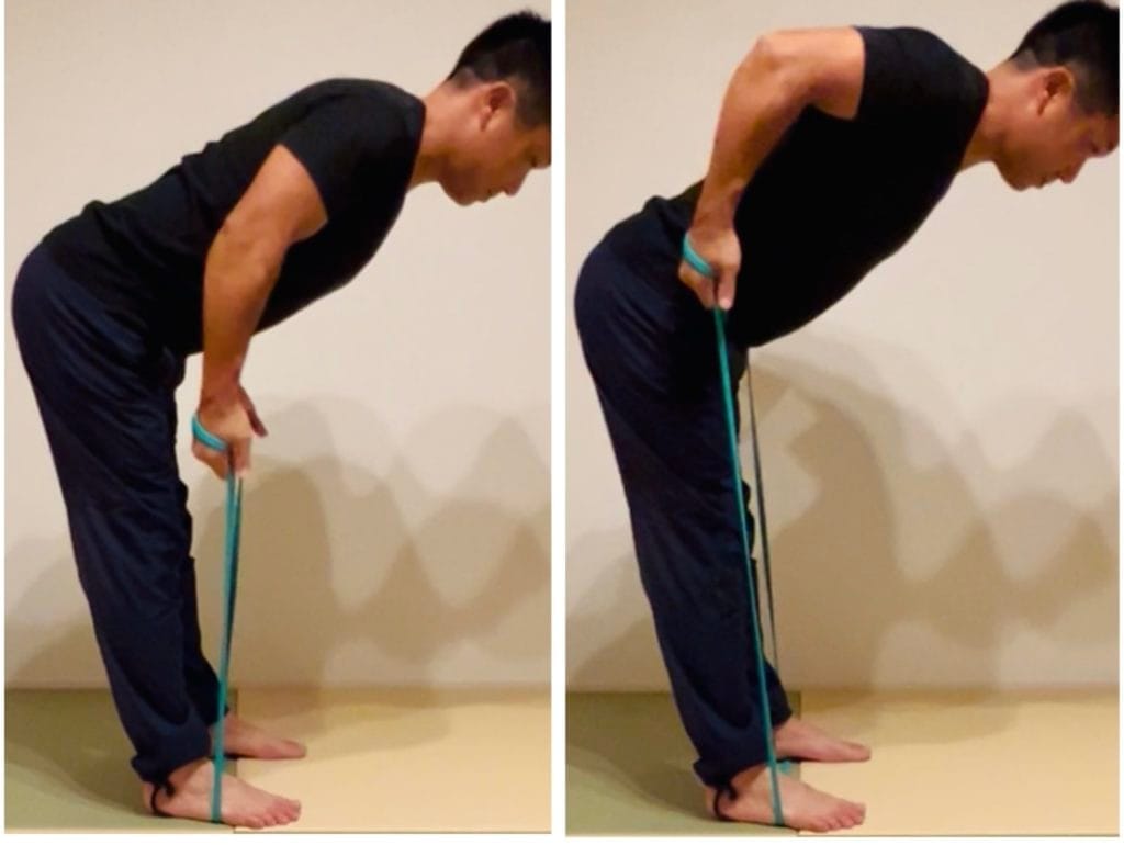 一方、座って行うことによるちょっとした利点もあります。それは、チューブの中央を引っ掛けている足の足首を伸ばしたり戻したりする動きを加えることで、腓腹筋やヒラメ筋などのふくらはぎの筋肉を鍛えることができるという点です。